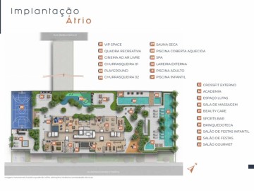 -Vip Space /Quadra / Cinema ao Ar Livre / 02 Churrasqueiras /Playground /Saúna / Piscina Coberta Aquecida / Piscina Extena Adulto e Infantil / Spa / Lareira / Crossfit / Academia / Espaço Lutas / Sala Massagem / Beauty Care / Sport Bar / Brinquedoteca / Salão de Festas Adulto e Infantil / Espaço Gourmet.