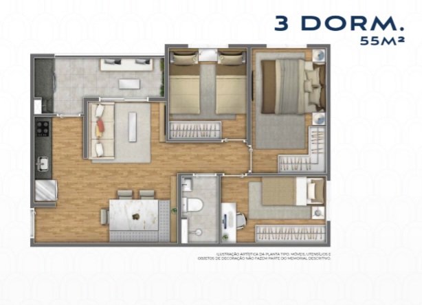Com 55,50m² de área total e privativa, este apartamento de 3 dormitórios é perfeito para quem busca um lar funcional e acolhedor. Desfrute de uma sala convidativa, um banheiro bem distribuído e a conveniência de 1 vaga de garagem.